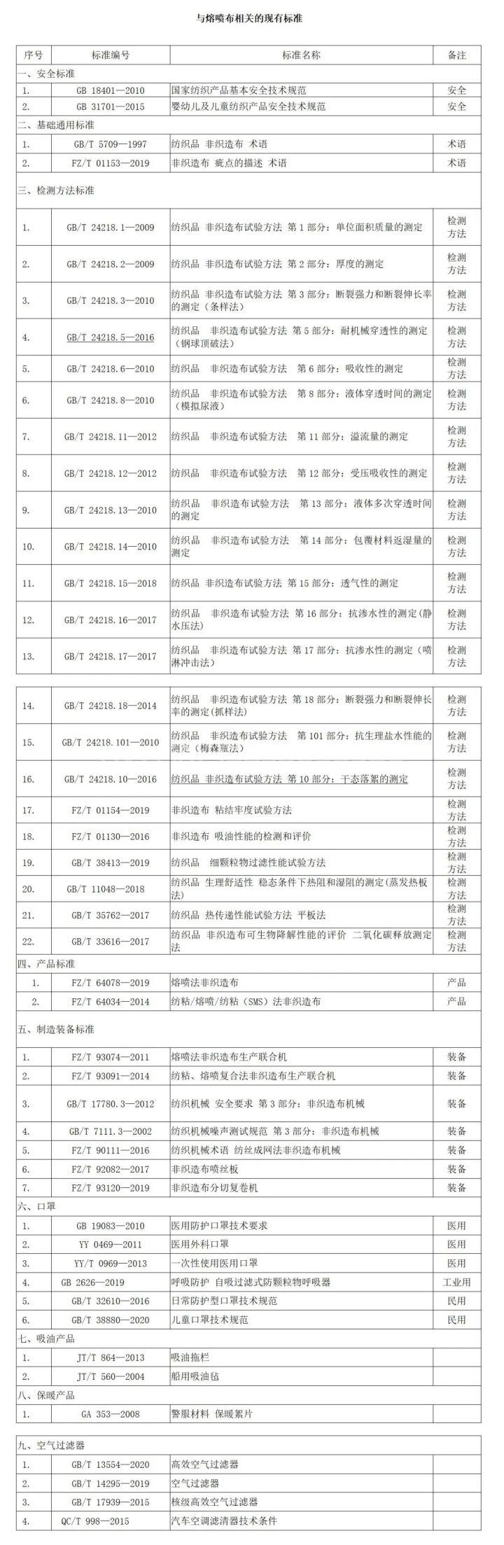 第三,熔喷布配套纺织装备标准7项,如FZ/T 93074—2011《熔喷法非织造布生产联合机》、FZ/T 93091—2014《纺粘、熔喷复合法非织造布生产联合机》和FZ/T 92082—2017《非织造布喷丝板》等为熔喷和复合非织造布生产提供了装备标准。