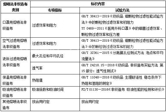 熔喷法非织造布每个包装单元应附有的标识内容应包括:产品类别、制造商名称和地址、生产批号、产品规格(单位面积质量、幅宽、卷长及卷重等)、执行标准、生产日期和保质期等,不同类别的熔喷法非织造布还应注明其专项指标及指标值,专项指标及测试方法见表1。