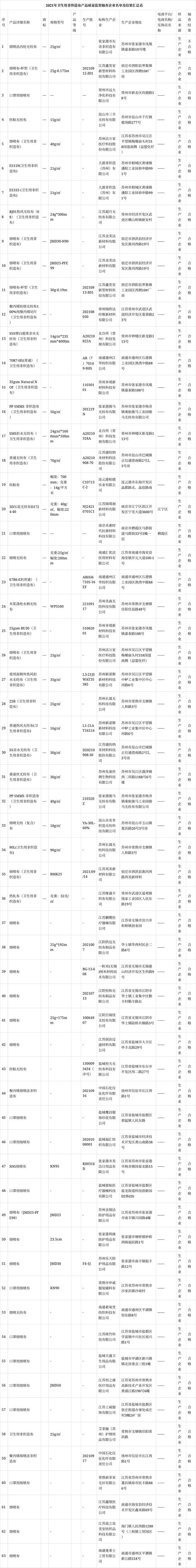 中国质量新闻网讯 据江苏省市场监督管理局网站11月2日消息,2021年3季度,江苏省纤维检验局对卫生用非织造布产品进行了省级监督抽查。共抽查产品63批次,合格62批次,合格率为98.4%。其中口罩滤材用卫生用非织造布38批次,合格37批次,合格率为97.4%;其他卫生用非织造布25批次,合格25批次,合格率100%。在38批次口罩滤材用卫生用非织造布中,根据明示的质量要求进行本次抽查全项检测判定合格的只有18批次,检验有效合格率为47.4%。