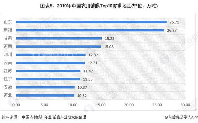 2019年我国农用薄膜需求地区主要为山东、新疆、甘肃、河南等地。其中山东地区农用薄膜需求量为26.71万吨,新疆地区需求量为26.27万吨,甘肃地区需求量为15.23万吨,河南地区需求量为15.08万吨。