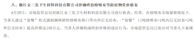 通报显示,金三发卫材在熔喷布市场紧缺情况下,通过“套餐”形式强制捆绑销售熔喷布和口罩内外层无纺布。“套餐”(1吨熔喷布+1吨内层无纺布+1吨外层无纺布)最高价格达150万元。涉嫌构成哄抬价格的违法行为,市场监管总局依法对当事人立案调查。