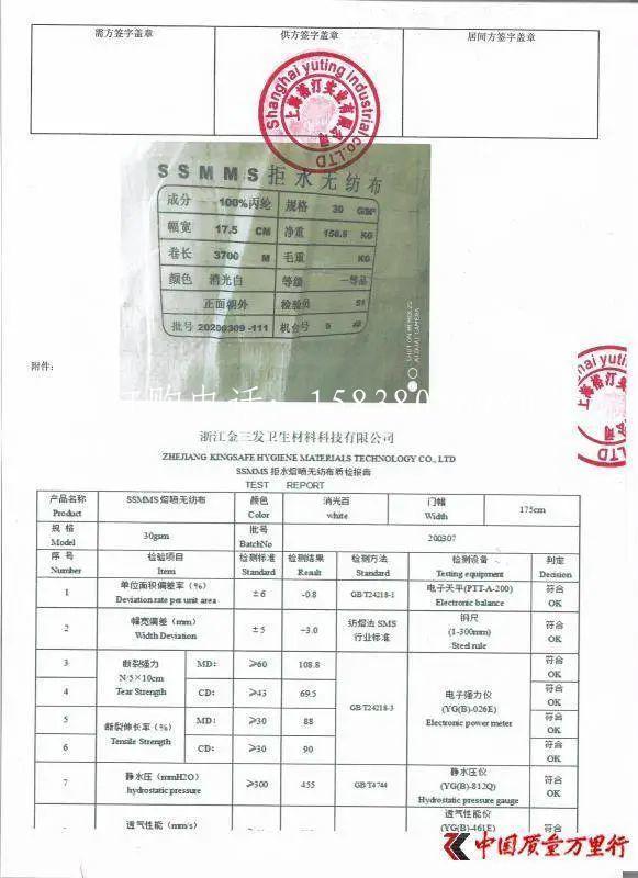 金山市场监管局执法大队陆冬叶表示,熔喷布的国家标准要7月1号起正式实施。但是上海裕汀提供给客户的这份自检报告与金三发这边提供给裕汀的这份是不是一样的,上海裕汀是不是存在PS的行为这个应该是能查清的。如果是同一份,那么则涉及到产品质量问题,应该由金三发负责。如果不一样,是上海裕汀修改的话,那么是上海裕汀这方的问题,则涉及到合同欺诈等方面的行为了。