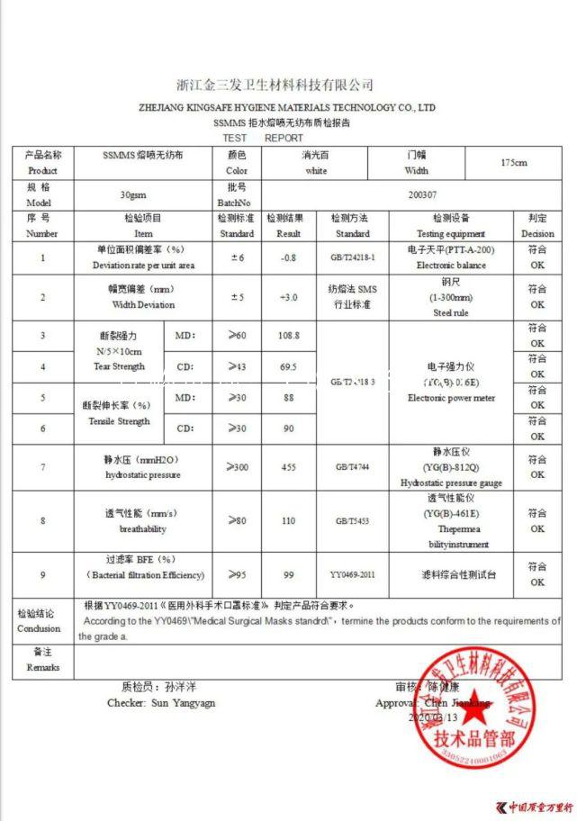 根据中国质量万里行记者提供的产品及包装图片,浙江金三发确认福建沃森购买的熔喷布是该企业的SSMMS拒水无纺布,这种布最多只能生产防护服,但绝对不能用于生产口罩,否则因其过滤率不达标而造成近距离传染事故。