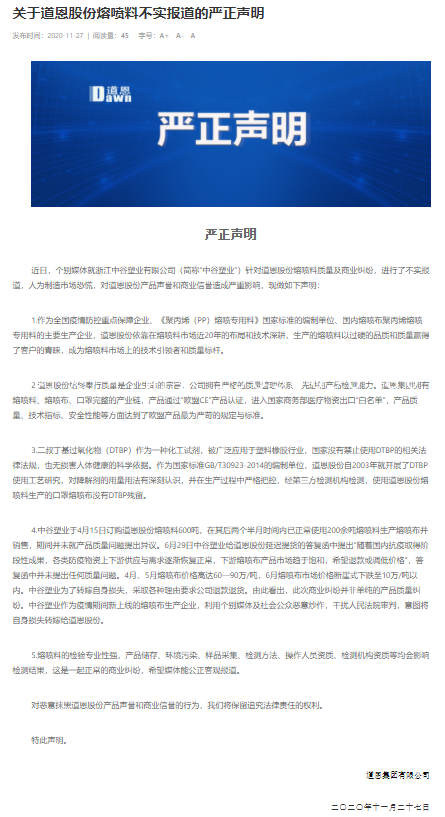 11月26日晚间,在吃瓜群众尚未弄清所谓“二叔丁基过氧化物”为何物的时候,道恩股份火速发布澄清公告,直指举报方中谷塑业“所言有虚”,将事件引向了另一个漩涡。公司在澄清公告中称,“中谷塑业之所以要求退货退款,真实原因并不是道恩股份原料质量问题,而是熔喷布市场趋于饱和、供过于求。”