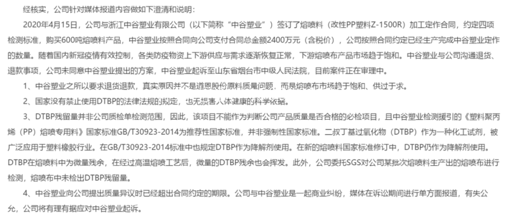 6月29日,中谷塑业给道恩股份延迟提货的答复函中提出,“随着国内抗疫取得阶段性成果,各类防疫物资上下游供应与需求逐渐恢复正常,下游熔喷布产品市场趋于饱和,希望退款或调低价格”,答复函中并未提出任何质量问题。此外,声明还提及,4月、5月熔喷布价格高达60—90万/吨,6月熔喷布市场价格断崖式下跌至10万/吨以内。基于此,声明提出,中谷塑业为了转嫁自身损失,采取各种理由要求公司退款退货。