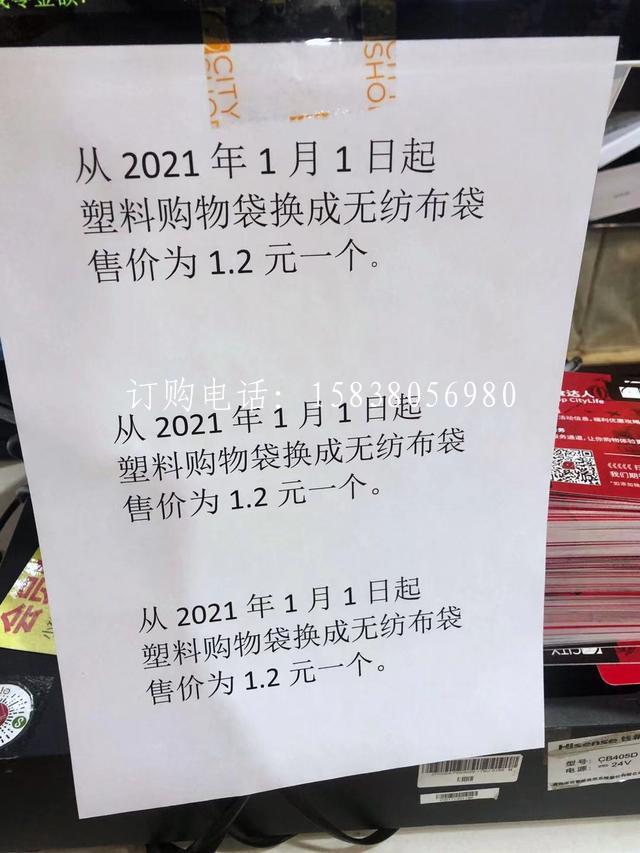 城市超市上海影城店的收银台上贴着这样一张告示:“从2021年1月1日起,塑料购物袋换成无纺布购物袋,售价为1.2元一个。”记者看到收银台上正放着一沓无纺布购物袋,规格相当于中等购物袋大小。