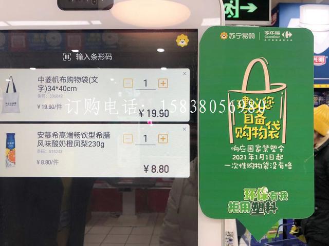 那么,买了一大堆东西却没带购物袋的消费者怎么办?家乐福中山公园店收银员介绍,超市目前提供免费的纸袋,消费者也可以购买环保袋,价格在几元至十几元之间不等。记者注意到,在自助收银机下方看到挂有一个帆布购物袋,扫描条码显示售价为19.9元。据家乐福相关工作人员介绍,之后收银台还将推出售价1元至10多元不等、可重复使用的无纺布袋供顾客选购。