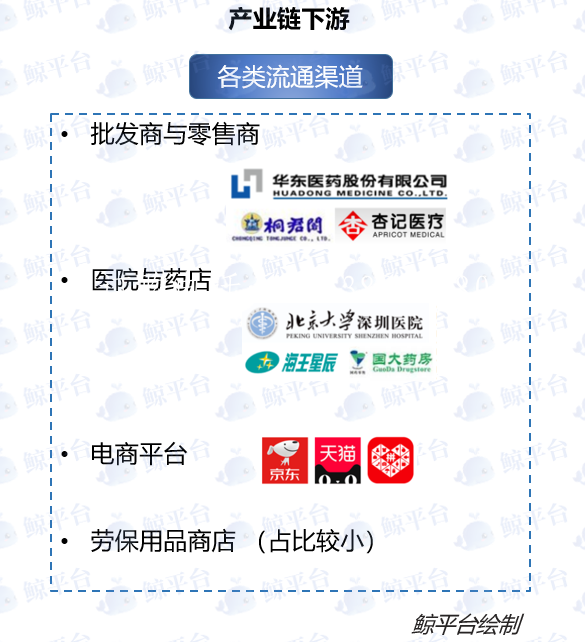 中国个人防护用品产业链下游涉及个人防护用品的各类流通渠道,包括批发商与零售商、医院与药店、电商平台、劳保用品商店等。据头豹研究院,线下渠道中,批发商采购量大,对价格较为敏感,通常与专业的个人防护用品生产商合作。零售商、医院及药店对个人防护用品的性能要求较高,通常与医疗耗材生产商合作。新型冠状病毒肺炎爆发后,电商平台由于可实现“无接触”购买受到终端消费者的喜爱,重要程度不断提升。中国的个人防护用品线下流通渠道分布与医疗水平、人口数量及人口密度相关,其中北京、上海的企业数量最多,占总体企业数量的30%以上。长三角、京津冀、重庆、广东等地的企业数量次之,占总体企业数量的30%以上,其余地区的企业数量占比不足40%。
