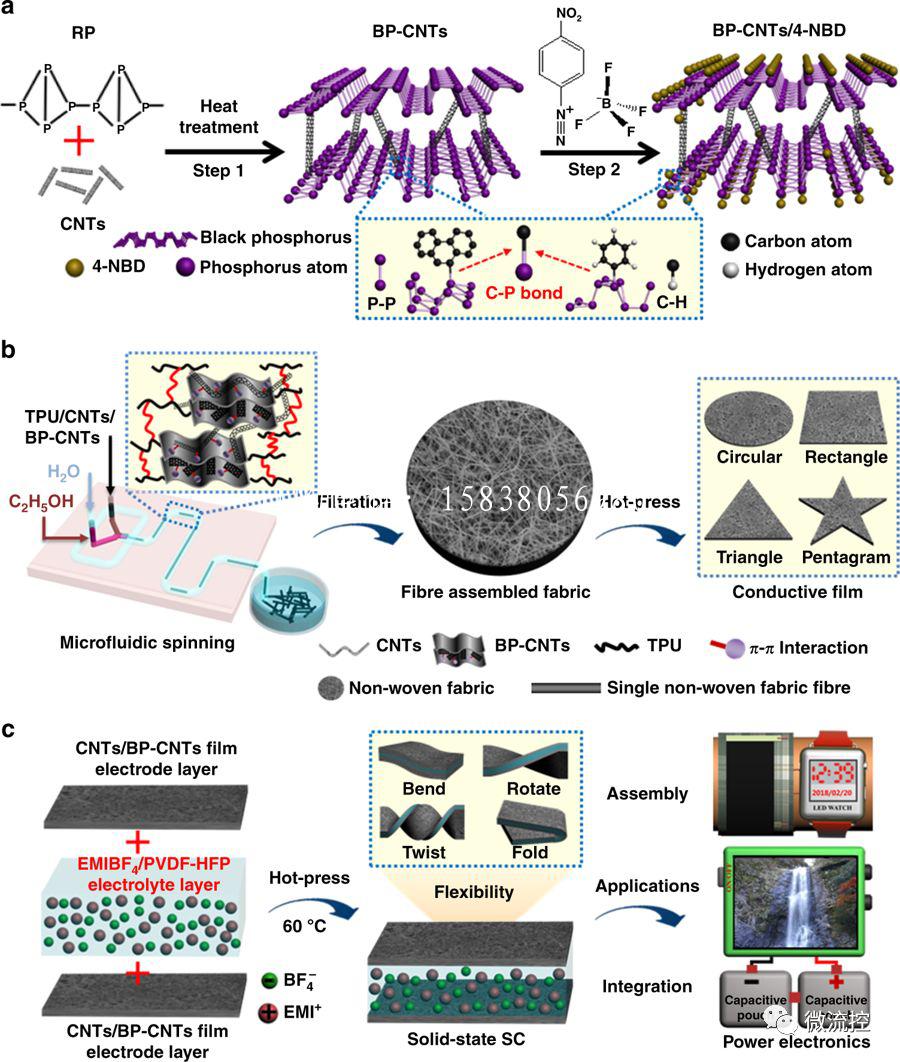 据该课题组陈苏教授和武观老师介绍,团队在导电性较差的黑磷材料层间,原位桥接碳纳米管,极大提高了其层间电子传导的效率;而且由于黑磷跟石墨烯一样,层间容易堆积,加入碳纳米管后,有效减轻了黑磷层间堆积,提高了比表面积,增大离子吸附表面,提高了离子扩散速率及累积量,使得黑磷具有较大的离子扩散通道。再者,团队将黑磷复合纺丝液,通过微流体纺丝技术,牵引、固化、熔合成黑磷微纳复合纤维无纺布电极材料,具备高导电性、高能量密度、优异柔性超级电容器功能。构筑成柔性超级电容器,具有较高的柔性和变形能力,可以集成到织物里,为可穿戴设备供能。