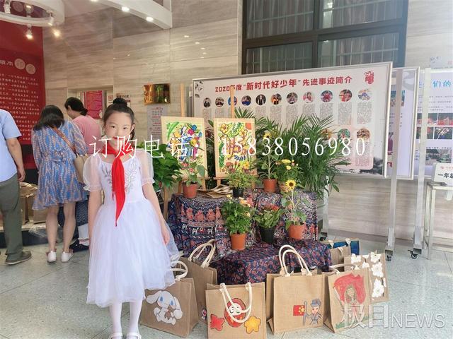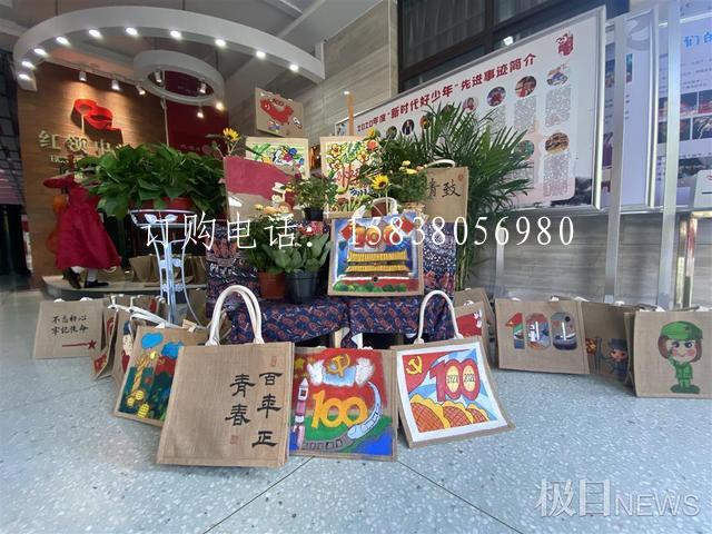 在教学楼楼梯口,极目新闻记者看到,一百三十余个手绘帆布袋陈列在展示台上,每名教师根据自己的喜好进行挑选。“这些帆布袋由学校美术和书法校队的学生手绘而成,还有一部分是学生在课后托管的兴趣班上完成的。”学校美术老师潘瑜介绍,手绘帆布袋的主题为庆祝建党100周年,学生发挥自己的想象力设计草图,再用丙烯颜料在帆布袋上绘制。