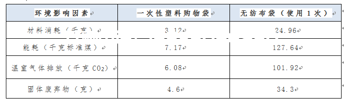 英国环境署在2011年公布的一项研究结果显示,无纺布袋至少需要重复使用11次,才能弥补它带来的污染。若无纺布袋只使用一次,那么单个无纺布袋的能耗是一次性塑料袋的17.8倍,碳排放是一次性塑料袋的16.7倍。假设无纺布袋的使用时间能够达到一年以上(按照一次/周测算),则无纺布袋的能耗就只有一次性塑料袋的34%,排放是一次性塑料袋的32%。因此无纺布袋需要长时间的重复使用才能达到环保的目的,否则会造成更大的环境污染。