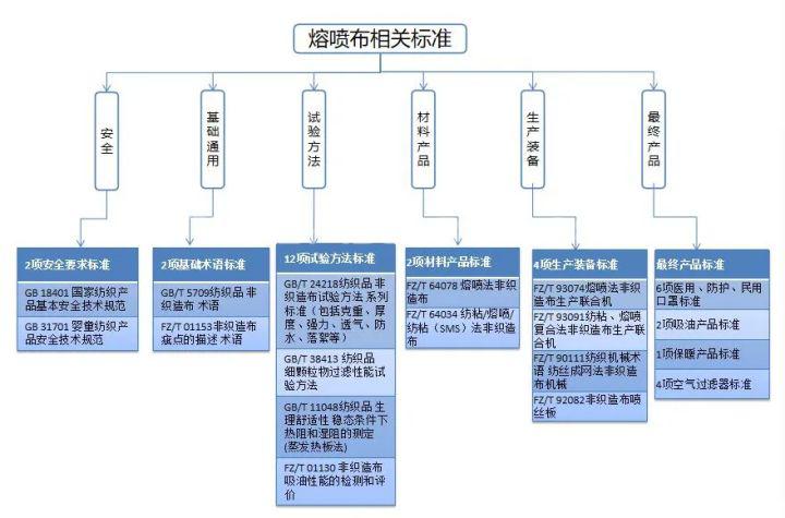 除上述产品标准之外,我国与熔喷布相关的标准还有近50项,其中,直接相关标准35项,包括通用安全标准、基础术语标准、产品标准、试验方法标准,基本涵盖了原材料、最终产品和生产装备等熔喷布相关的整个产业链,其标准体系框架见图1。主要具有以下特点: