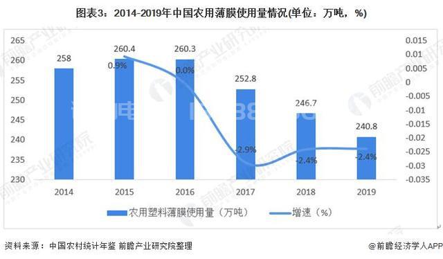 近年来,我国塑料薄膜产量保持在1000万吨以上,农用塑料薄膜产量和使用量呈波动下降态势,2019年农用薄膜使用量为240.8万吨。